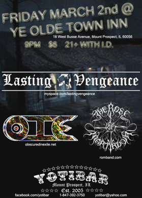 1/27/09 For those of you who live a little closer to the lake, Obscured In Exile is coming to Metal Shakers February 14th! We're playing with BLACK SEPTEMBER, HAMMERLORD, and SABLE BELDAM. Show starts at 9pm, 21+, 8 bux . \m/! |